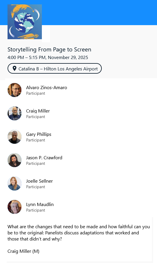 | Panelists: | Alvaro Zinos-Amaro, Craig Miller, Gary Phillips, Jason P Crawford, Lynn Maudlin, and Joelle Sellner; Moderated by Craig Miller |
