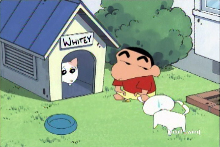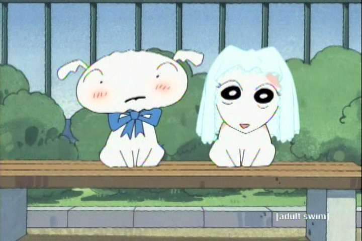 Another dog has gotten lost in Kasukabe, and runs into Whitey. Shin and Whitey do their best to hide this female pup from Mitzi, and decide the two should get married. The other kindergarteners perform the ceremony.